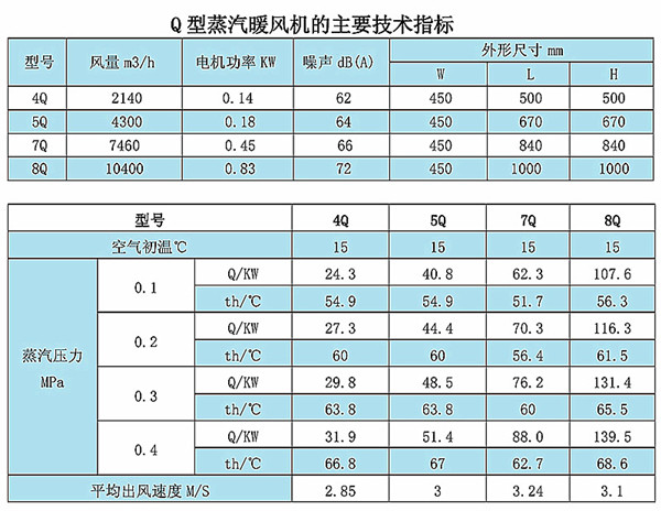 Q型蒸汽暖風機是以蒸汽為熱媒的采暖設備。它將室內循環加熱,是工礦企業的廠房和公共建筑中常用的采暖器之一,蒸汽暖風機主要由外轉子軸流風機、熱交換器、格柵風口、殼體等組成。熱交換器由叉排列螺旋翅片管束組成,其熱翅片管束采用先進工藝,把0.3mm*12mm鋁帶用機械繞片方法,繞在Φ20mm*3的無縫鋼管上,使散翅片及散熱管接觸面廣面緊,傳熱性能良好,并且耐腐蝕。