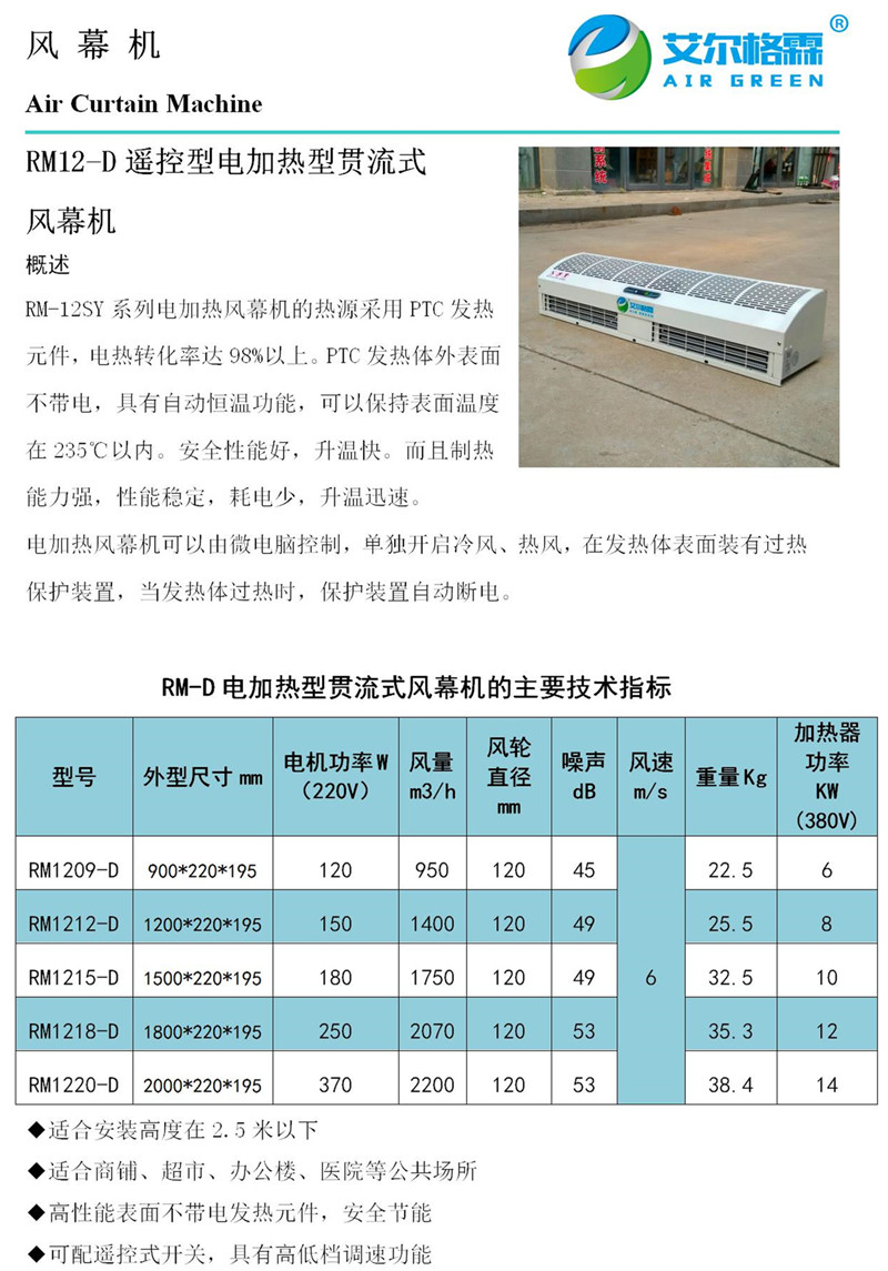 RM-D系列電加熱風(fēng)幕機的熱源采用PTC發(fā)熱元件,電熱轉(zhuǎn)化率達98%以上。PTC發(fā)熱體外表面不帶電,具有自動恒溫功能,可以保持表面溫度在235℃以內(nèi)。安全性能好,升溫快。而且制熱能力強,性能穩(wěn)定,耗電少,升溫迅速。