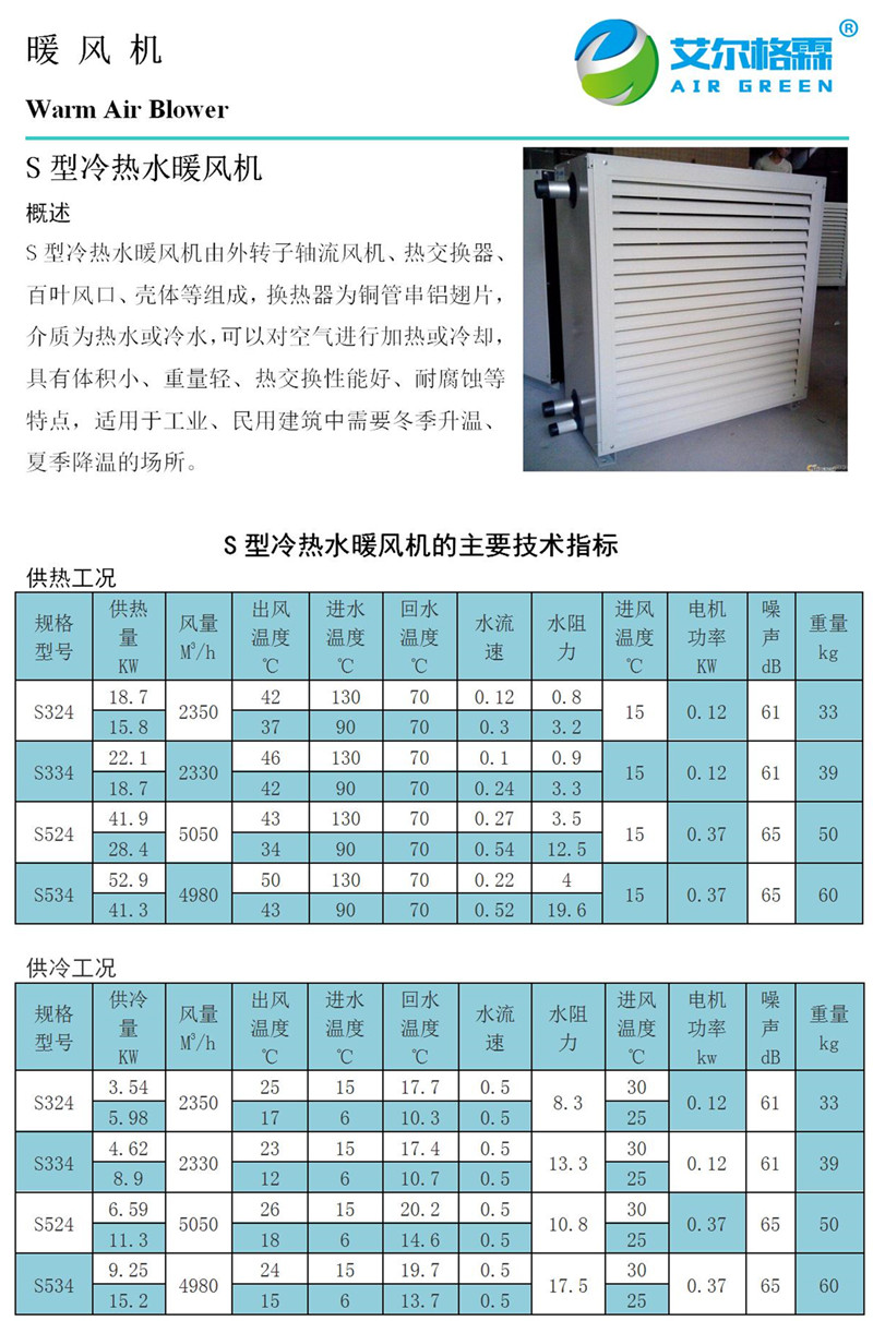 S型冷熱水暖風(fēng)機(jī)由外轉(zhuǎn)子軸流風(fēng)機(jī)、熱交換器、格柵風(fēng)口、殼體等組成,換熱器為銅管串鋁翅片,介質(zhì)為熱水或冷水,可以對(duì)空氣進(jìn)行加熱或冷卻,具有體積小、重量輕、熱交換性能好、耐腐蝕等特點(diǎn),適用于工業(yè)、民用建筑中需要冬季升溫、夏季降溫的場(chǎng)所。