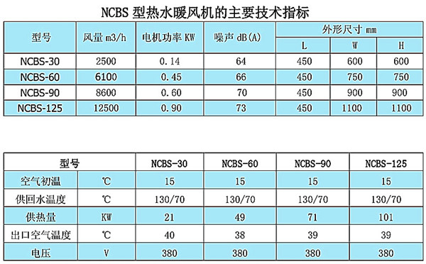 艾爾格霖熱水暖風機共分為GS型高溫熱水暖風機、TS中溫熱水暖風機、NCB型熱水暖風機三種類型,其技術參數如下