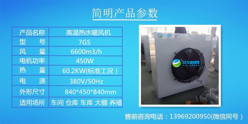 7GS型高溫熱水暖風機,風量6600m3/h,電機功率450W,額定熱量60.2KW,外形尺寸840*450*840mm