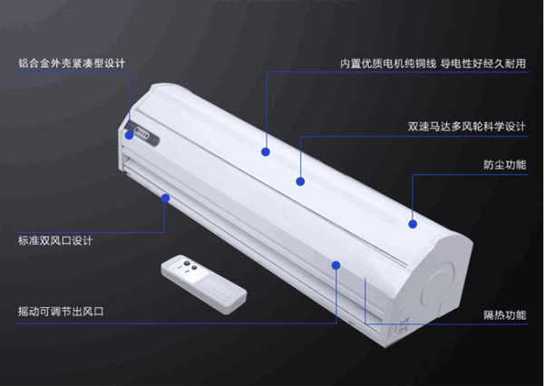 豪華型離心式風幕機采用獨立導風板設計,風向可隨意調節。采用選型遙控或按鍵式開關,高、低兩檔調速功能。采用純銅優化電機,