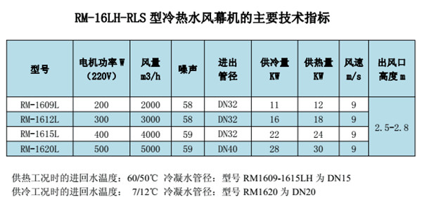 RM-16LH-RLS型旋轉門專用冷熱水型離心式熱風幕機,是專為商場、超市、賓館、酒店等民用建筑設有旋轉門的場所設計生產的風幕機。由離心風機、冷熱水交換器、百葉風口、鋼板外殼組成。以熱水為熱媒,以冷水為冷媒,選用160mm離心風輪,噪聲低、熱交換效率高,外形美觀。風幕機出風口接送風管道,風道尺寸由旋轉門的直徑、進出口寬度及華蓋高度確定。電源為220V/50Hz。適合3米以下的安裝高度。