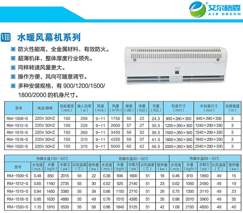 按照門的寬度,貫流式空氣幕有四個規格,0.9米 1.2米 1.5米 1.8米,分別用數字09 12 15 18來表示。完整的空氣幕型號就是RM1509-S空氣幕 RM1512空氣幕 RM1515空氣幕 RM1518空氣幕。