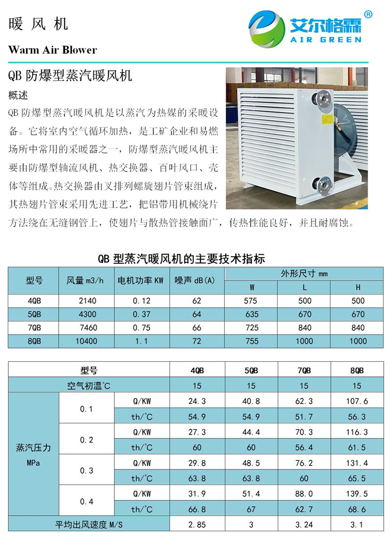 Q-B防爆型蒸汽暖風機是在普通型蒸汽暖風機基礎上的延伸產品。采用BT35-11防爆型軸流風機,適合煤礦、化工等特殊行業。