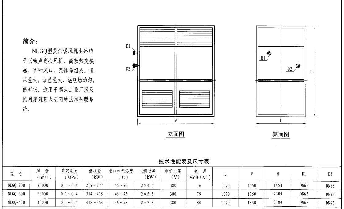艾爾格霖NLGQ型柜式蒸汽暖風機組由外轉(zhuǎn)子低噪音離心風機,高效熱交換器,便也風口,殼體等組成,送風量大、加熱量大、溫度場均勻,能耗低。適用于高大空間工業(yè)廠房、民用建筑高大空間等熱風采暖系統(tǒng)。